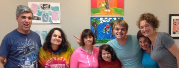 The members of SPHERE Art completed their Spring session last evening. Along with teacher Stacey Kolbig, members selected which works to hang on the walls of 421 Main Street. The works are rich in variety ranging from colorful paintings of playful juxtapositions such as a snake on roller blades, a horse shopping at Vera Bradley to photo collages of members’ faces (see if you can identify whose nose that is next to whose mouth, whose eyes – its a puzzle of fun,) printmaking and book sculptures that can be hung on the wall.